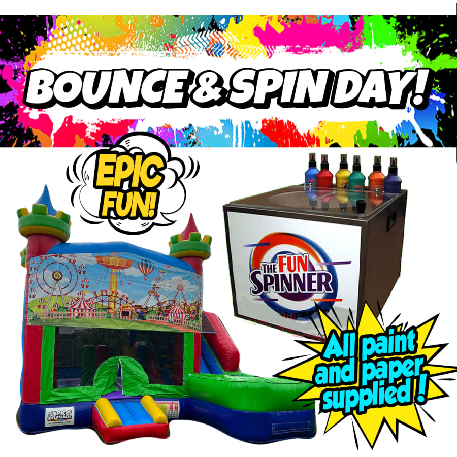 Our bounce and spin package will keep a large group of kids entertained all day long. Our 7in1 combo castles are available plain or in a load of themes like Bluey, Minecraft, Super Heroes, Carnival, Dinosaur, Sports etc. They feature a bounce area, inflated obstacles, basketball ring, climb and slide all in one.
