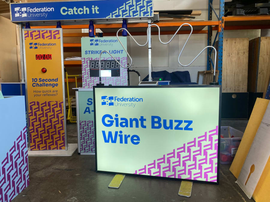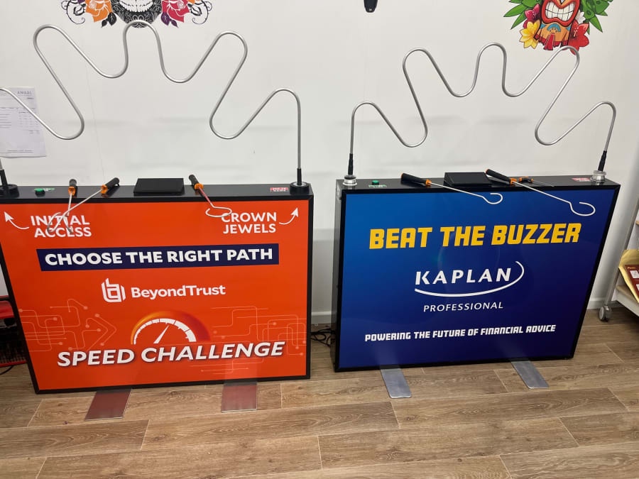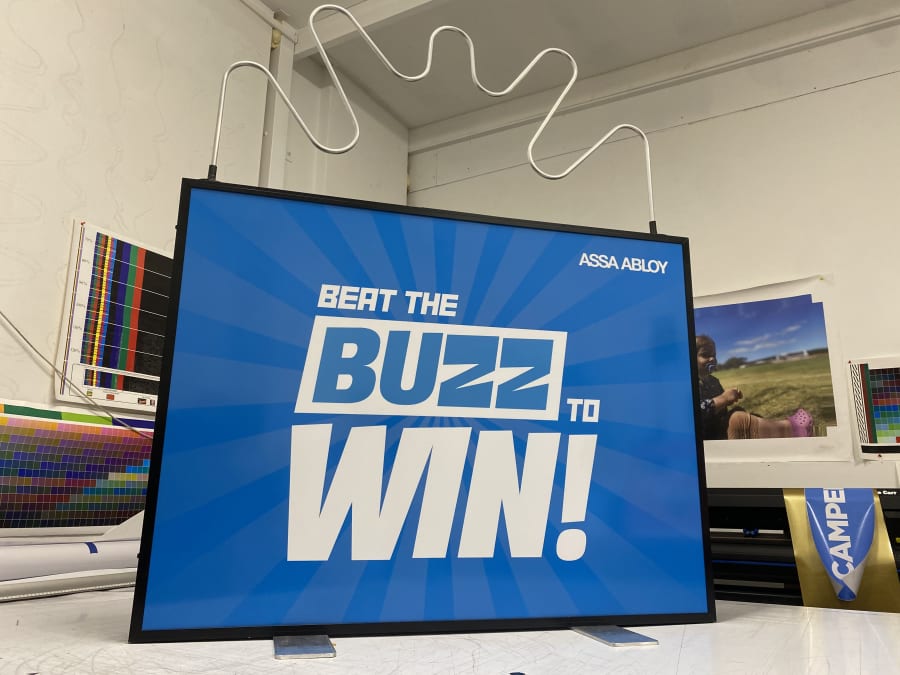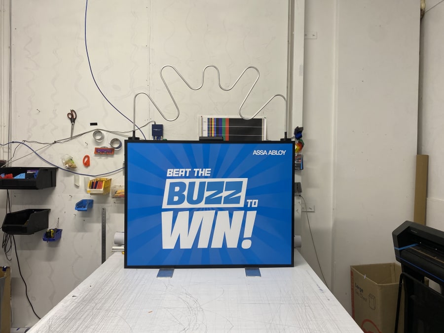 Our custom made Buzz Wire game has been built into a mega 1200 x 900 surround which can be branded in your own livery. We offer in house digital print and fitting at very affordable rates.