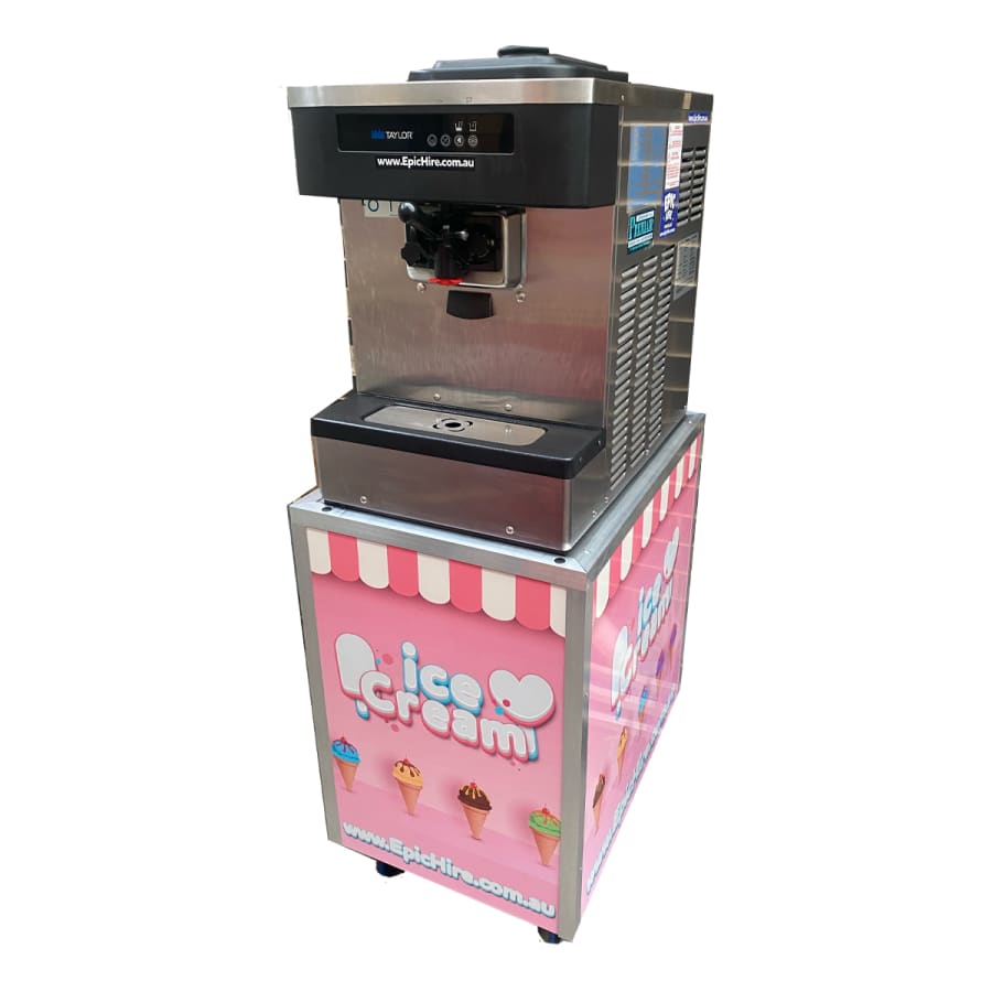 Machine comes on own cabinet and includes 100 serves of ice cream. Your choice of cups or cones.