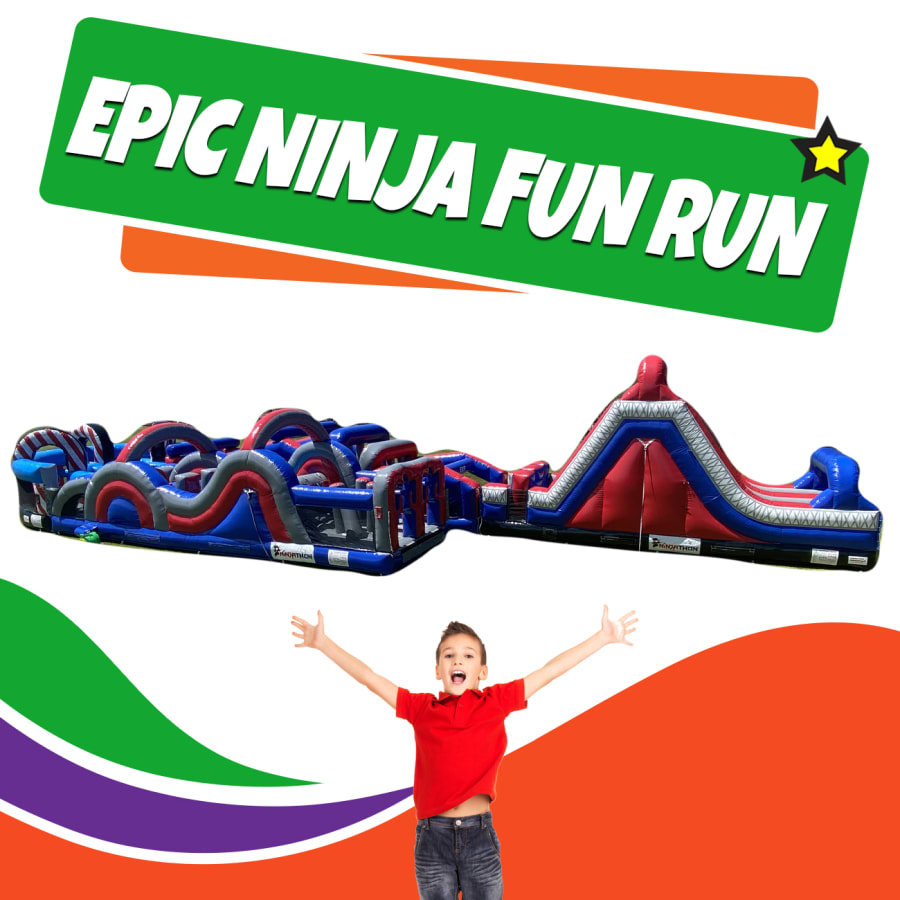 the Epic Ninja Fun Run combines radical, mega, u turn and rock climb slide to form 40+ meters of inflated obstacles, slides, tyre run, squeeze walls, tunnels and loads more!