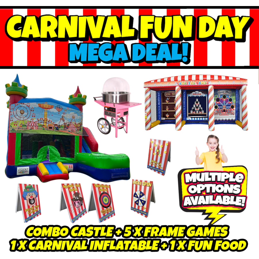 Our Carnival Mega package is an awesome value option to keep a bunch of kids entertained all day long. This package can cater for larger groups with multiple fun activities on the go at once.